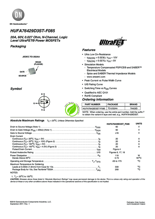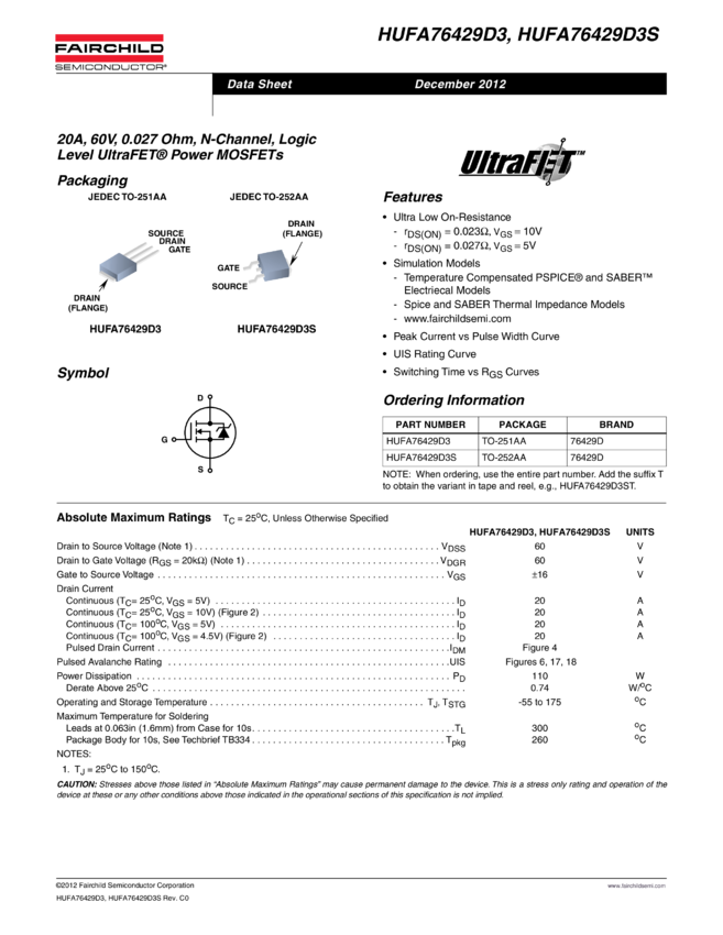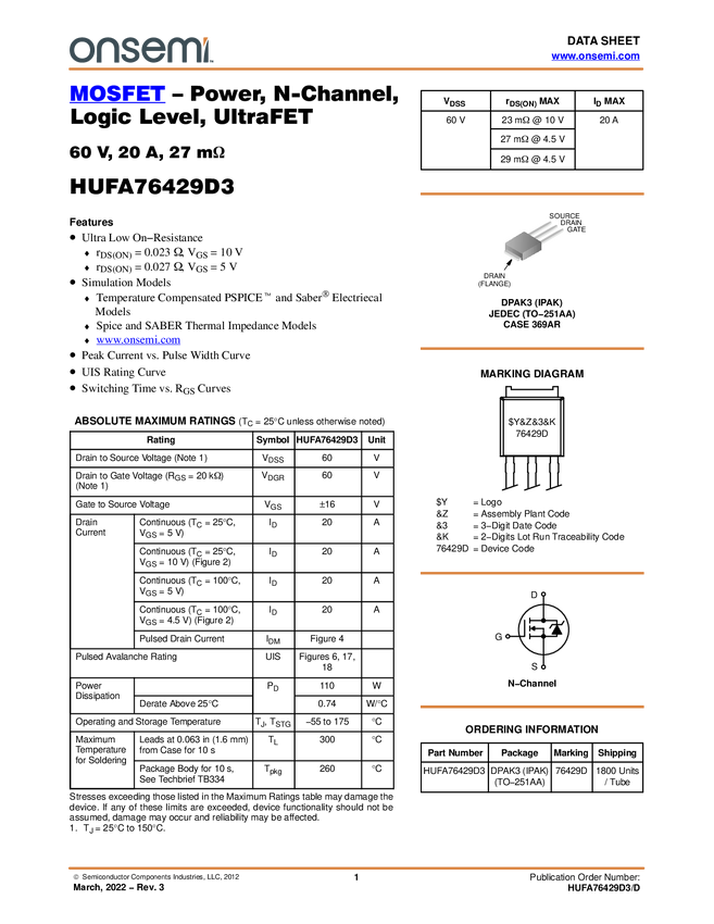 N-Channel Logic Level UltraFET Power MOSFET 60V, 20A, 27mΩ