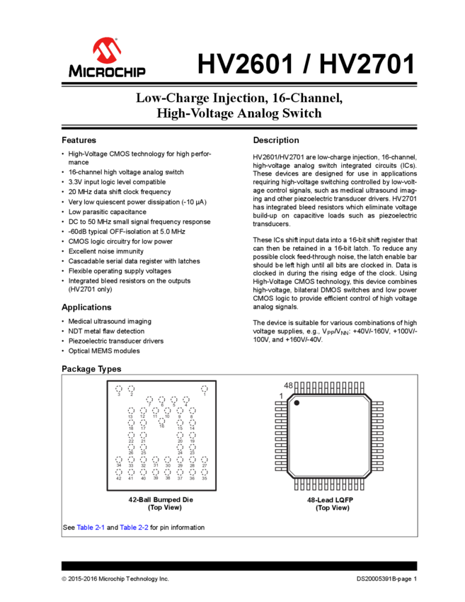 HV2601 / HV2701 Datasheet - Low Charge Injection, 16-Channel, HV Analog Switch