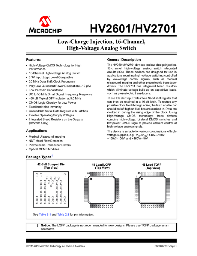 HV2601/HV2701 - Low-Charge Injection, 16-Channel, High-Voltage Analog Switch Data Sheet