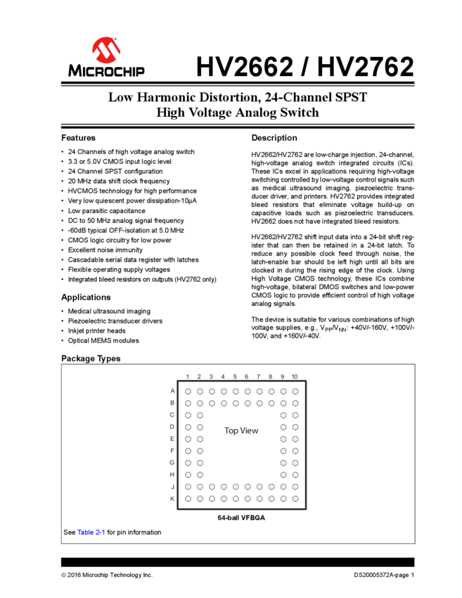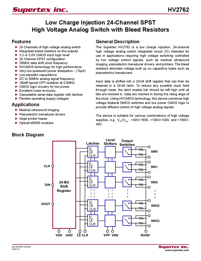 HV2662/2762 Low Harmonic Distortion, 24-Channel SPST High Voltage Analog Switch Data Sheet