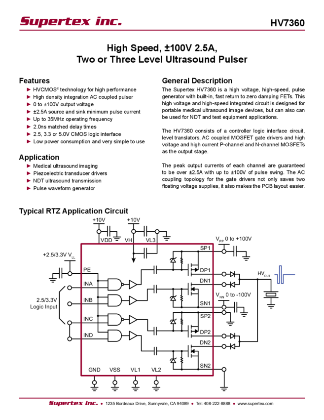 HV7360 Datasheet - High Speed, ±100V 2.5A, Two or Three Level Ultrasound Pulser (04/05/2012)