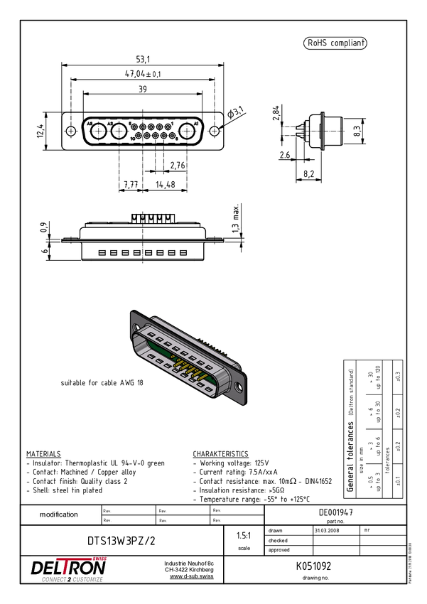 Deltron Connectors Deltron DTS 13W3 PZ/2 Złącze D-Sub, hybrydowe 180 ° Ilość styków: 13 1 szt.