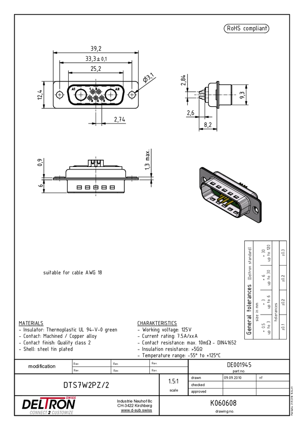 Deltron Connectors Deltron DTS 7W2 PZ Złącze D-Sub, hybrydowe 180 ° Ilość styków: 7 1 szt.