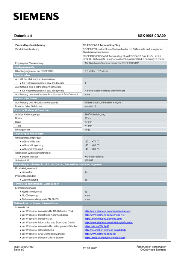 Siemens 6GK1905-0CA00 Wtyczka hybrydowa Szybkość transmisji LAN 12 MBit/s