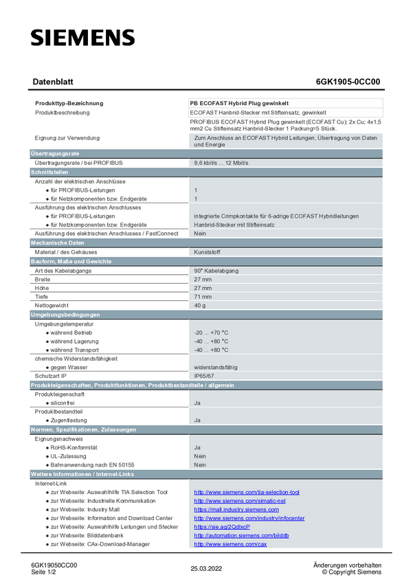 Siemens 6GK1905-0CC00 Wtyczka hybrydowa Szybkość transmisji LAN 12 MBit/s