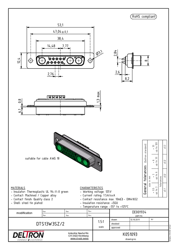 Deltron Connectors Deltron DTS 13W3 SZ Złącze D-Sub, hybrydowe 180 ° Ilość styków: 13 1 szt.