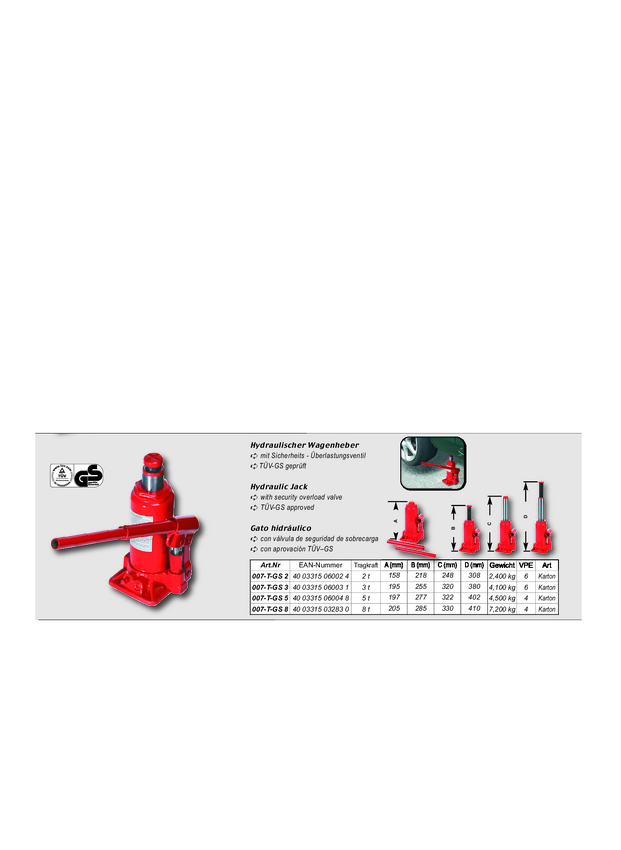Podnośnik hydrauliczny 007-T-GS-2T, wysokość pracy 170-308 mm, udźwig 2 t