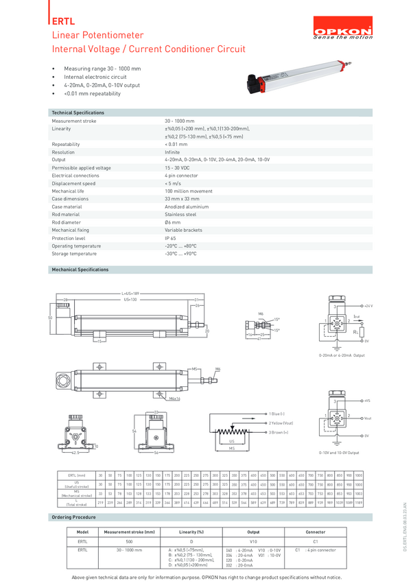 Transduktor Opkon ERTL-150-D-I40-C1, 30 V/DC, Długość skoku 150 mm