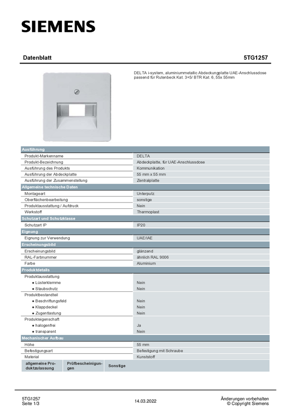 Siemens Osprzęt elektroinstalacyjny Zaślepka Gniazdo UAE/IAE/ISDN Delta aluminiowy (metaliczny) 5TG1257 1 szt.