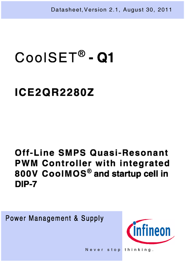 Układ scalony; ICE2QR2280ZXKLA1; PMIC; SMPS; kontroler PWM; 10,5-25V; 1 kanał; DIP7; THT; INFINEON; RoHS