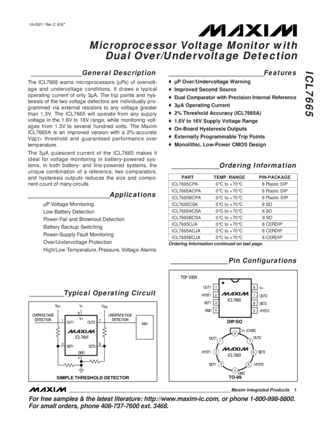 ICL7665 µP Voltage Monitor with Dual Over/Undervoltage Detection