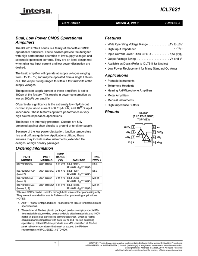 ICL7611, ICL7612, ICL7614, ICL7616, ICL7621, ICL7622, ICL7624, ICL7631, ICL7632, ICL7634, ICL7641, ICL7642, ICL764X Single/Dual/Triple/Quad Operational Amplifiers