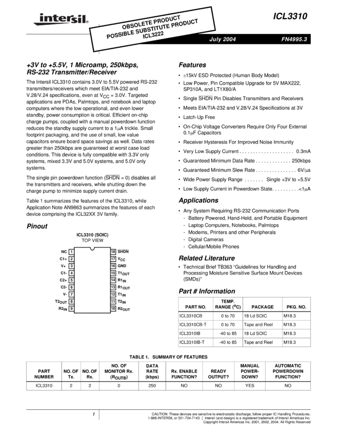 +3V To +5.5V, 1 Microamp, 250kbps, RS-232 Transmitter/Receiver