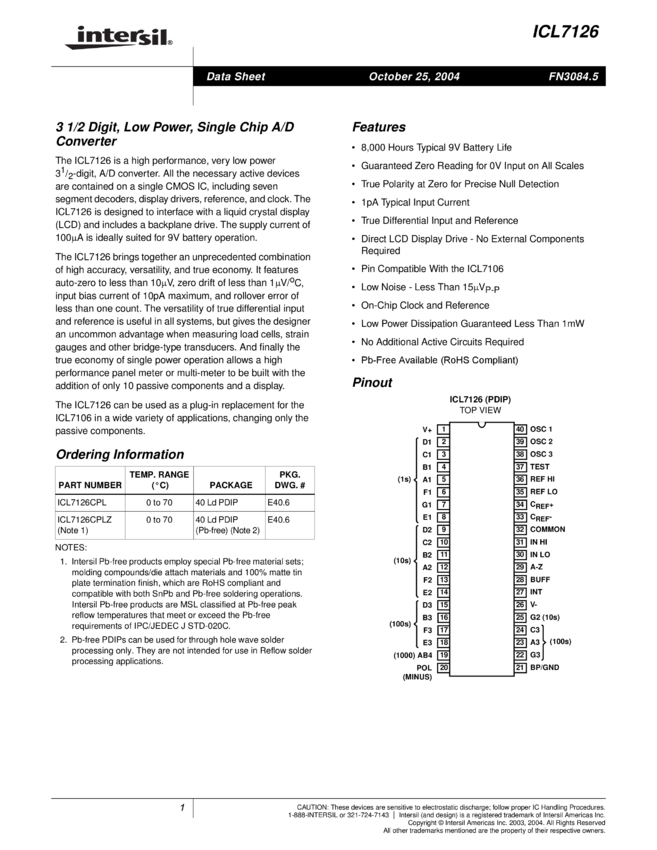 ICL7126 Low-Power, 3 1/2 Digit A/D Converter
