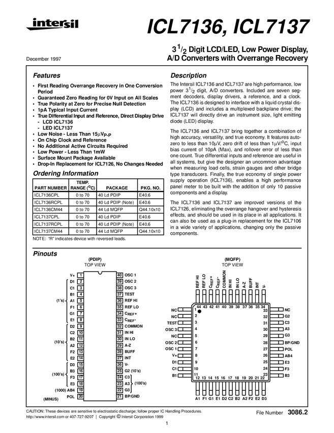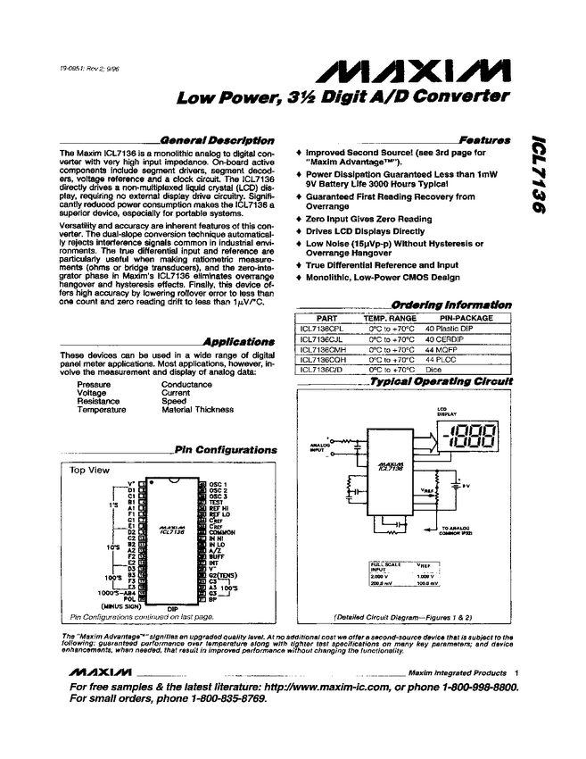 3 1/2 Digit LCD/LED, Low Power Display, A/D Converters with Overrange Recovery