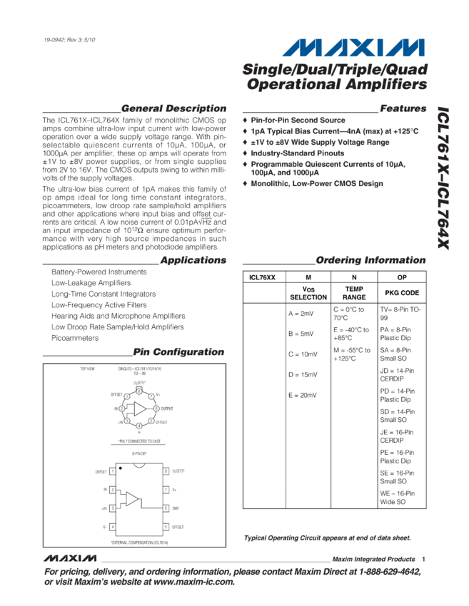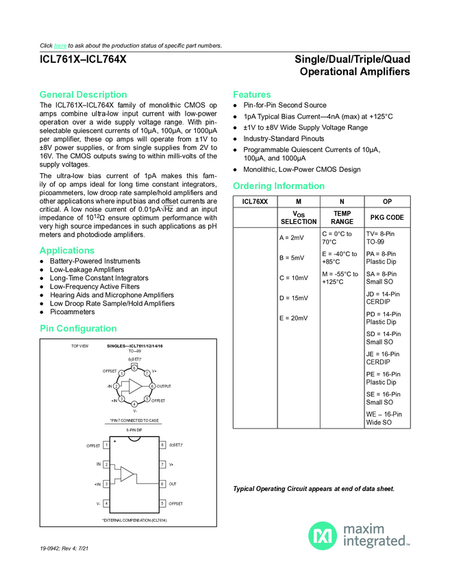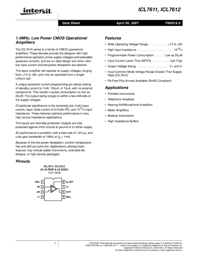 ICL7611, ICL7612, ICL7614, ICL7616, ICL7621, ICL7622, ICL7624, ICL7631, ICL7632, ICL7634, ICL7641, ICL7642, ICL764X Single/Dual/Triple/Quad Operational Amplifiers