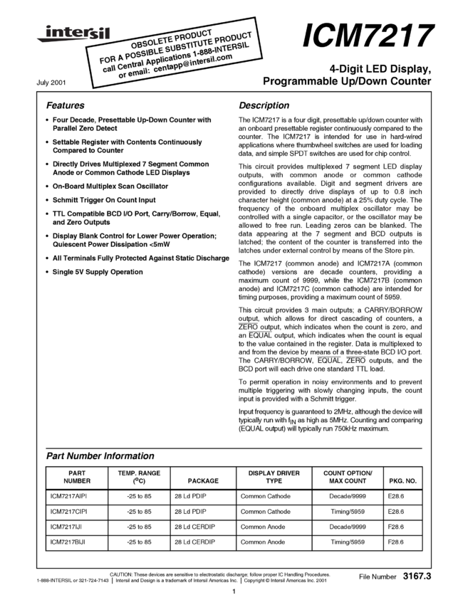 ICM7217, ICM7217A, ICM7217B, ICM7217C 4-Digit, Presettable, LED Up/Down Counter