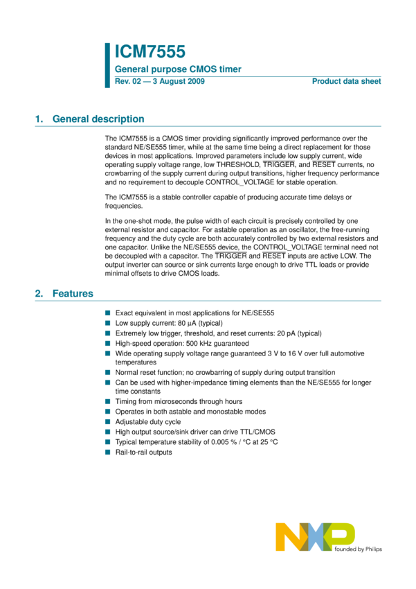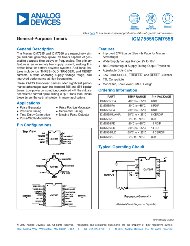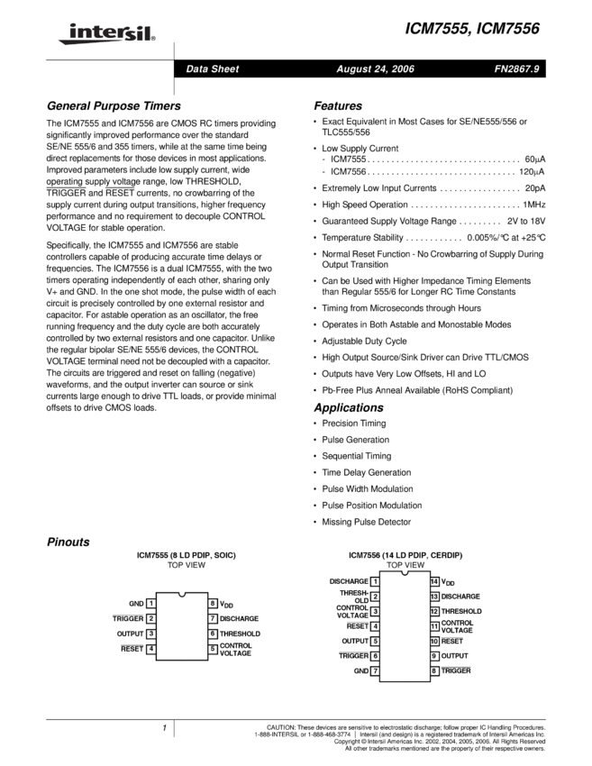 ICM7555, ICM7556 Low-Power, General-Purpose Timer
