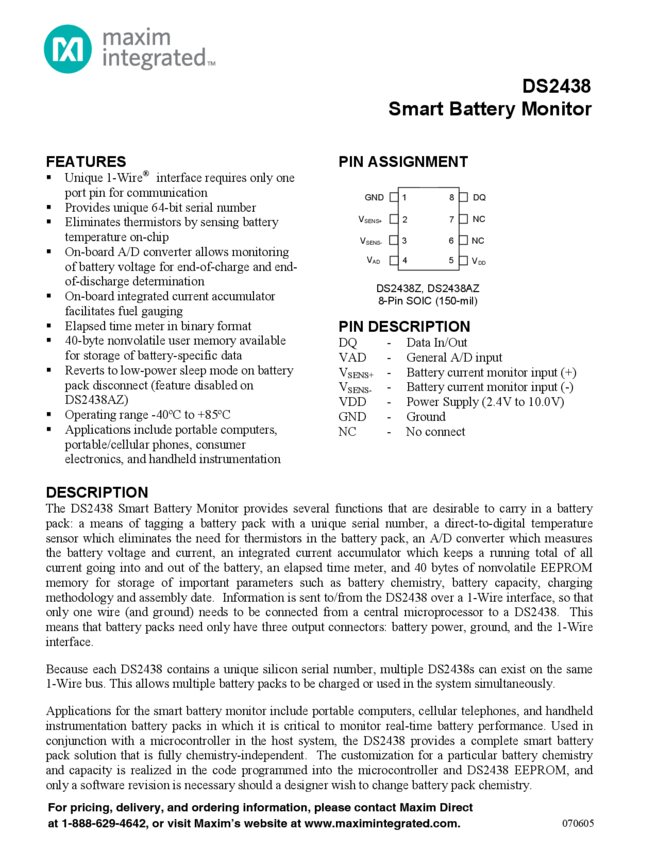 DS2438 Battery ID, Temperature, Voltage, Current Monitor with Real Time Clock