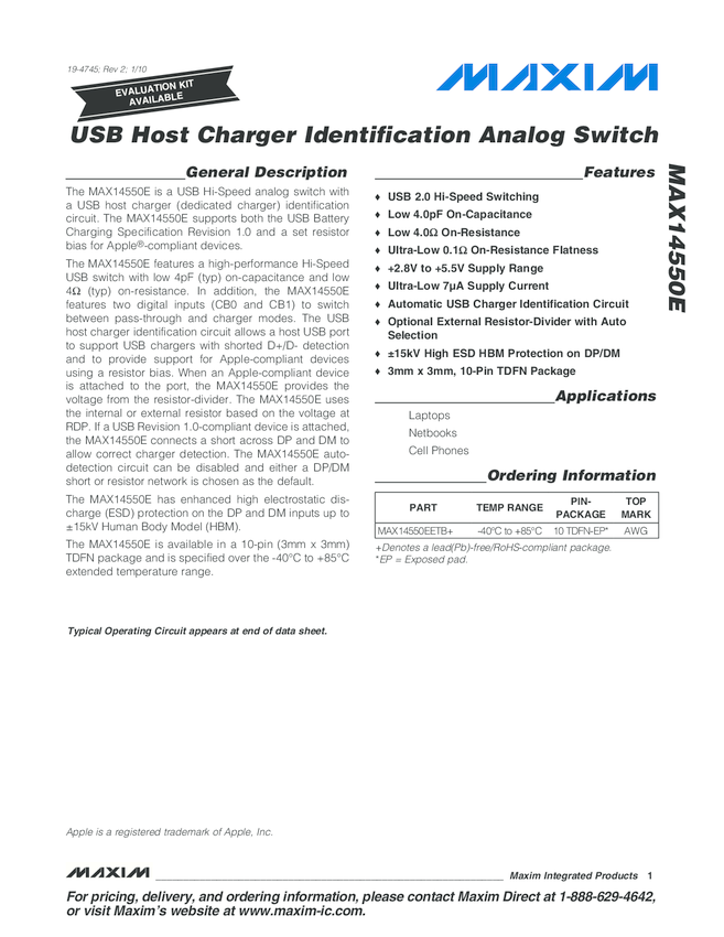 MAX14550E USB Host Charger ID Switch for Sleepmode Charging