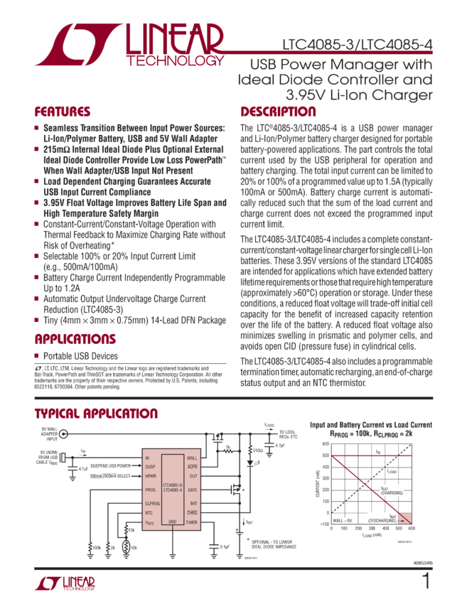 USB Power Manager with Ideal Diode Controller and 3.95V Li-Ion Charger