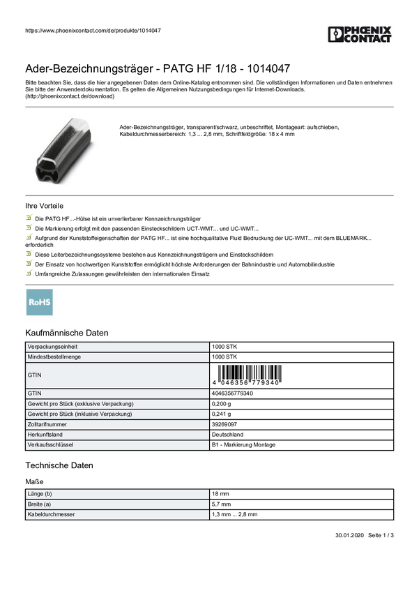Uchwyt identyfikatora Phoenix Contact PATG HF 1/18 1014047, montaż: nasuwanie, 1000 szt.