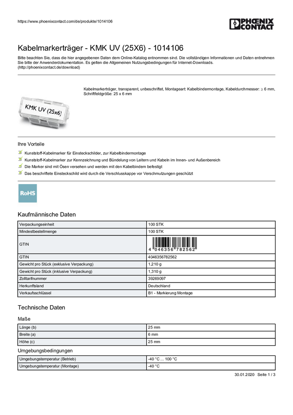 Uchwyt identyfikatora Phoenix Contact KMK UV (25X6) 1014106, montaż: opaska kablowa, 100 szt.