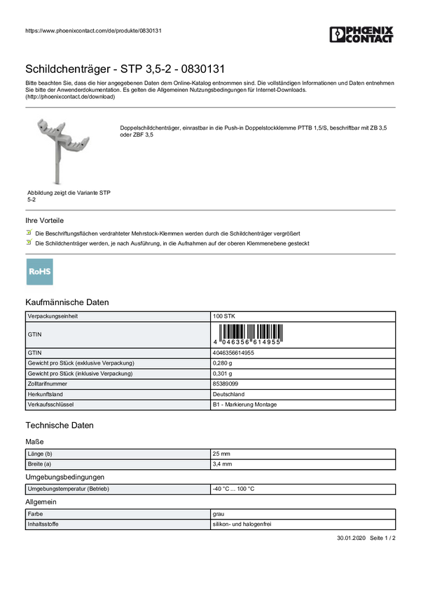 Phoenix Contact 0830131 STP 3,5-2 Uchwyt identyfikatora Sposób montażu: zaciskanie szary 100 szt.