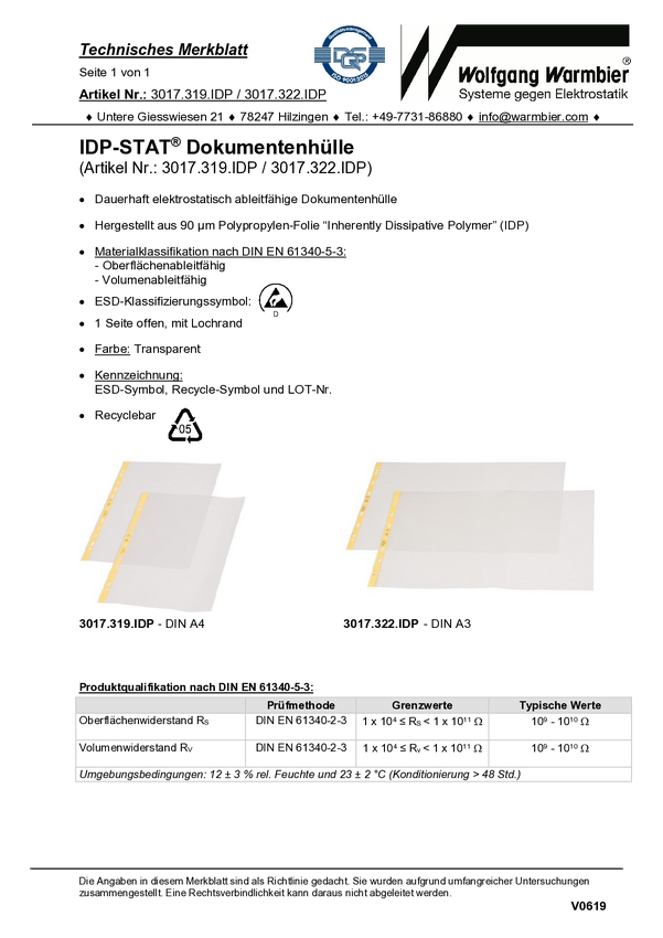 Koszulka na dokument ESD z rozładowaniem Wolfgang Warmbier 3017.319.IDP
