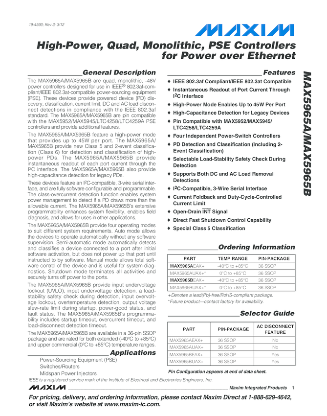 MAX5965B High Power, Quad, IEEE802.3at/af compliant PSE controller for Power-over-Ethernet