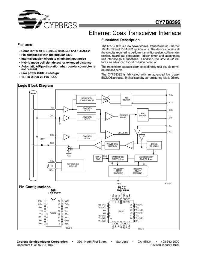 Ethernet Coax Transceiver Interface kompatybilny z IEEE802.3 10BASE5 i 10BASE2 Pin kompatybilny z innymi popularnymi 8392 obudowa PLCC-28; zakr.temp. 0-70;