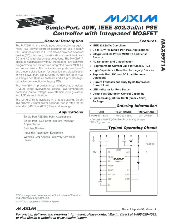 MAX5971A Single Port, 40W, IEEE802.3af/at PSE Controller with Integrated Power MOSFET