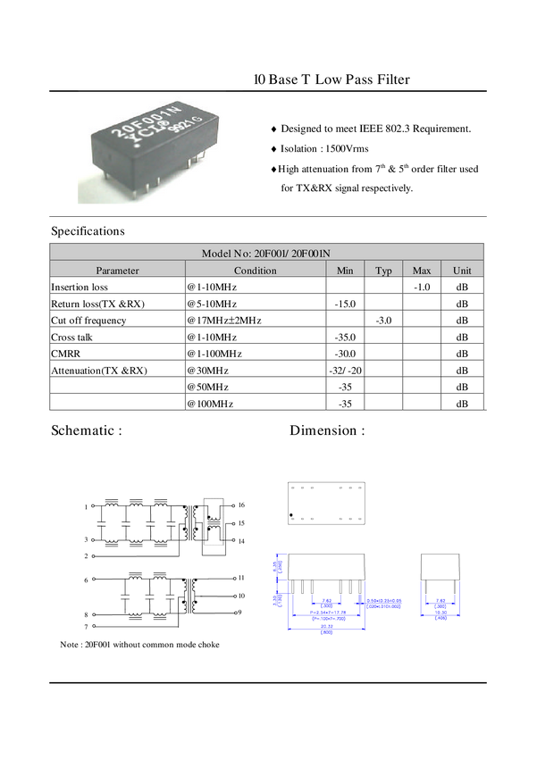 Transformator linii IEEE802.3 10 Base T ( filtr dolnoprzepustowy ) Low Pass Filter 20,32mm x 10,3mm x 6,35mm / piny 7,62mm / 0,3"; produkcja pakowany po 25 sztuk aktualnie wrsja ROHS 20F001NG YCL