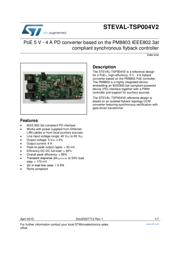 PoE 5 V - 4 A PD converter based on the PM8803 IEEE802.3at compliant synchronous flyback controller