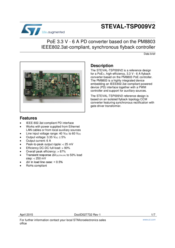 PoE 3.3 V - 6 A PD converter based on the PM8803 IEEE802.3at-compliant, synchronous flyback controller