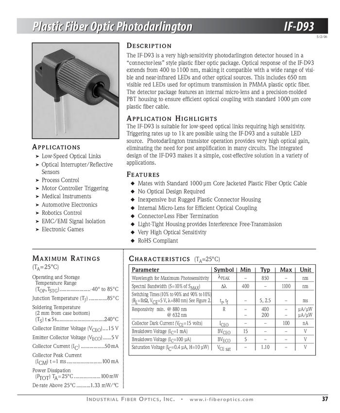 Plastic Fiber Optic Phototransistor 650 nm TR 20us TF 20us do kabla plastykowego 1000um; Responsitivity 50uA/uW Lowest cost; simplest to use photodetector