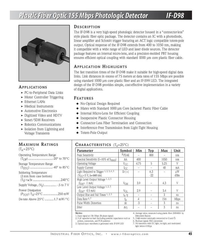 Photodetector LOGIC; TR 7 ns; TF 7 ns; TP 12 ns; Threshold 17 uW -17,5 dBm Totem-pole output device for data rates up to 55 Mbps; dla długości fali 660 nm