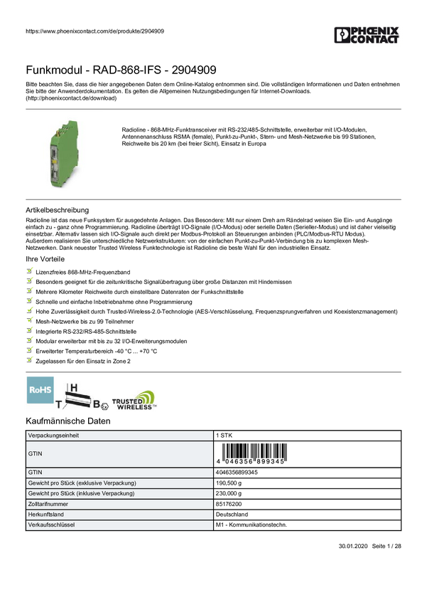 Moduł zdalny PLC Phoenix Contact RAD-868-IFS 2904909, 1 szt.
