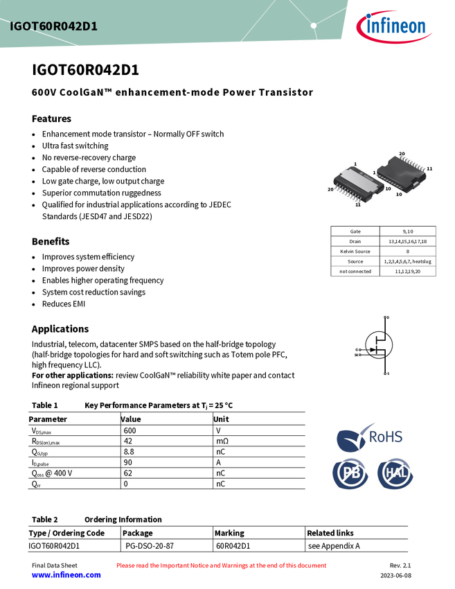 600 V CoolGaN™ e-mode power transistor for high power applications in top side cooled power package The IGOT60R042D1 enables more compact topologies and increased efficiency at higher frequency operation. It is certified through an extensive GaN-specific qualification process, exceeding industry standards. Housed in the leaded SMD DSO-20-87 package, it is designed for optimal power dissipation required in modern data centers, server , telecom , renewables, and numerous other applications.