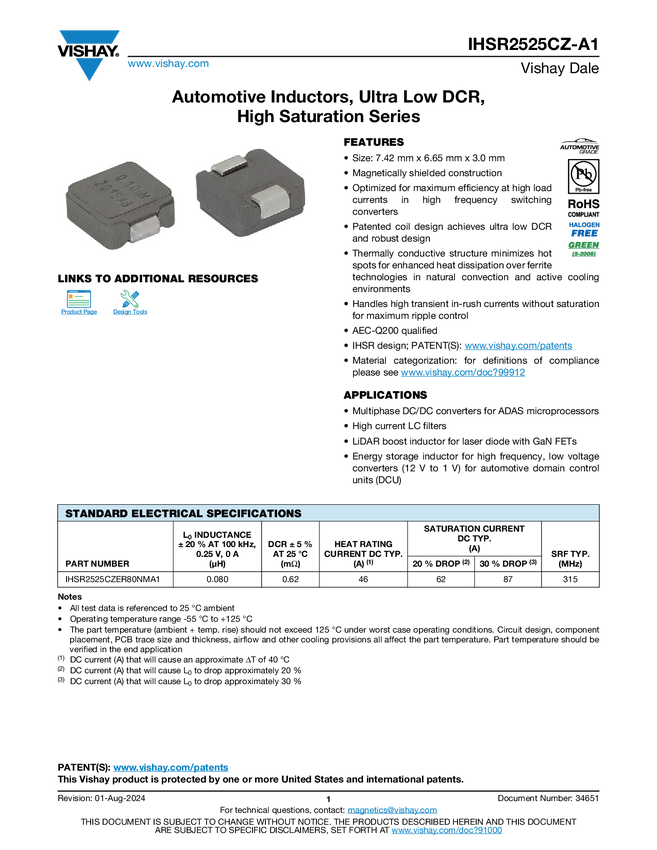 Automotive Inductors, Low Inductance, Ultra Low DCR With Options Between High Temperature 155 °C and High Saturation Rating