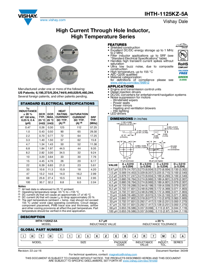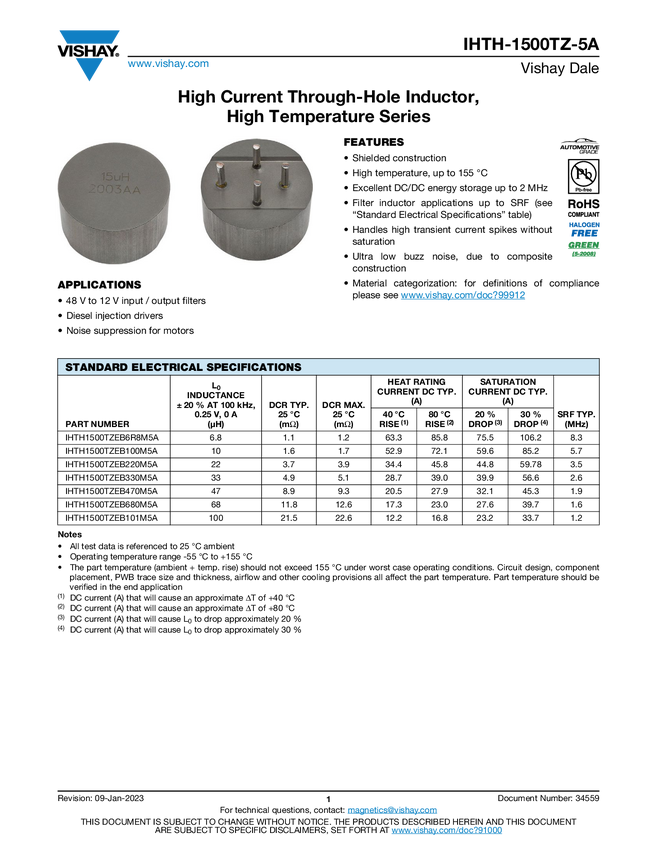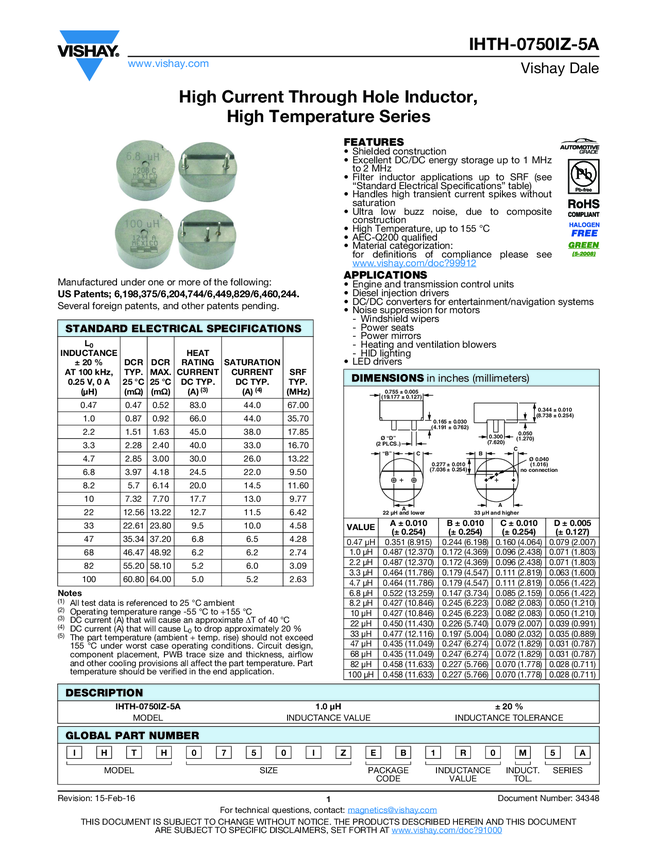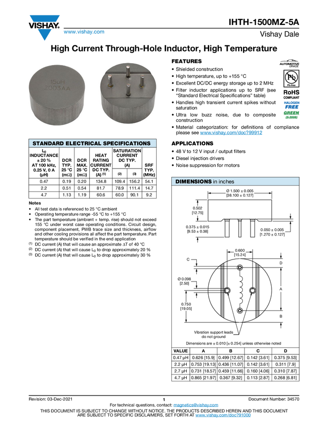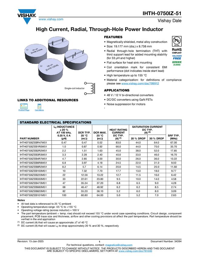 Automotive High Current, Radial, Through-Hole Power Inductor