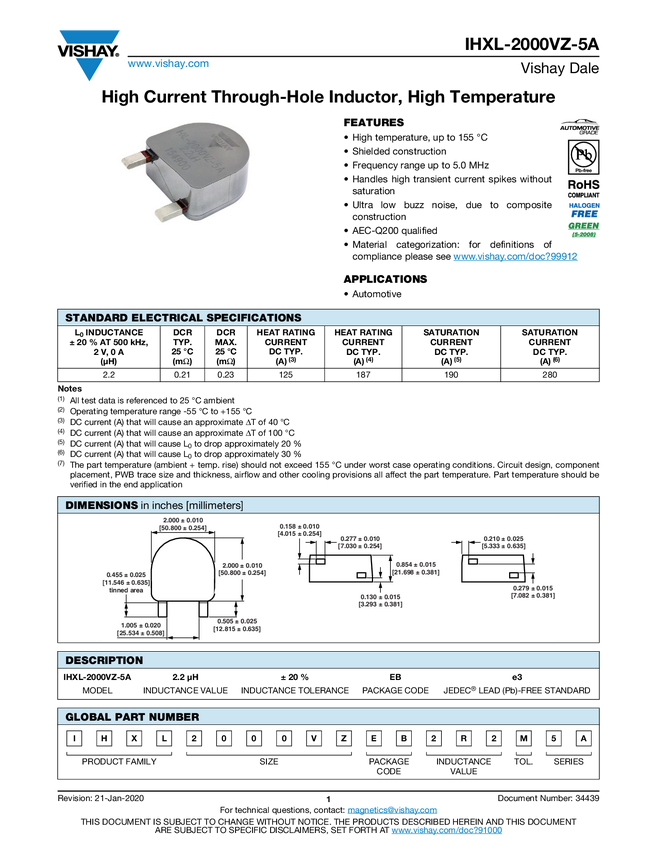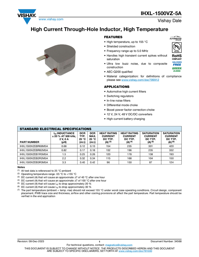 Automotive, High Current, Radial, Through-Hole Inductor, High Temperature (155 °C)