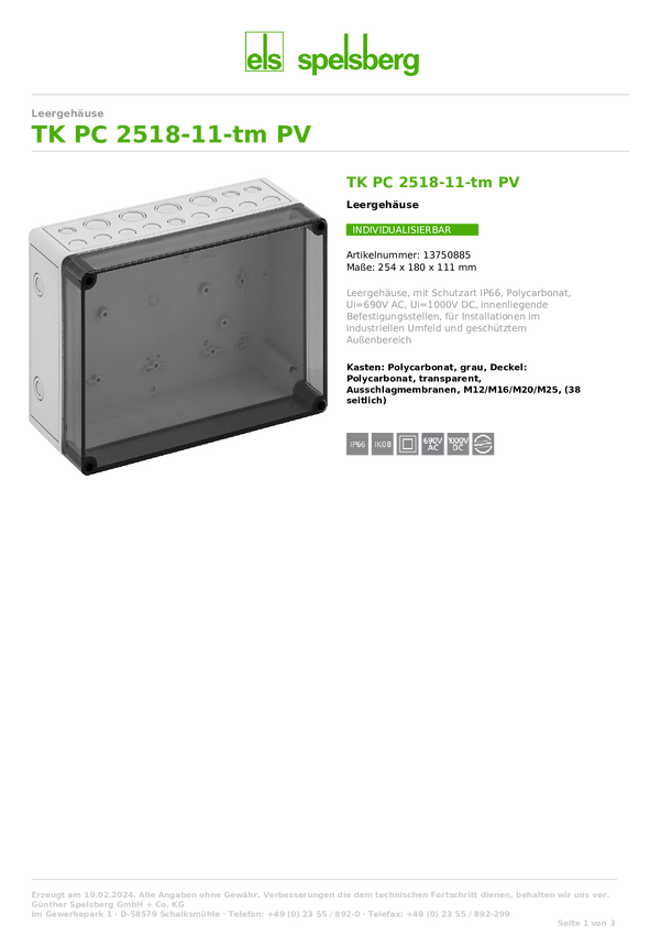 Spelsberg 13750885 Pusta obudowa TK PC 2518-11-tm PV, II, IP66, IK08, 180 mm x 254 mm x 111 mm , 1 szt.
