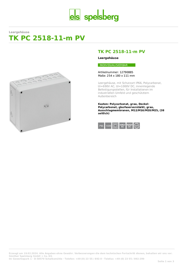 Spelsberg 12790885 Pusta obudowa TK PC 2518-11-m PV, II, IP66, IK08, 180 mm x 254 mm x 111 mm , 1 szt.