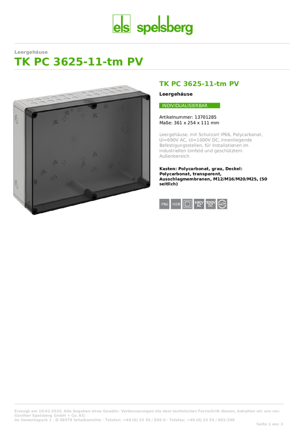 Spelsberg 13701285 Pusta obudowa TK PC 3625-11-tm PV, II, IP66, IK08, 254 mm x 361 mm x 111 mm , 1 szt.