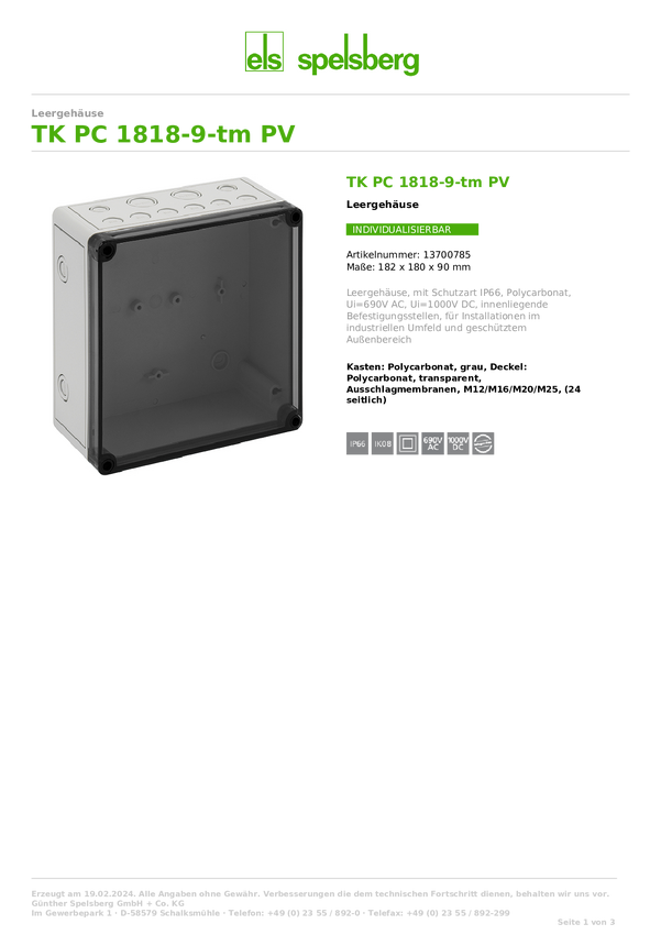 Spelsberg 13700785 Pusta obudowa TK PC 1818-9-tm PV, II, IP66, IK08, 180 mm x 182 mm x 90 mm , 1 szt.