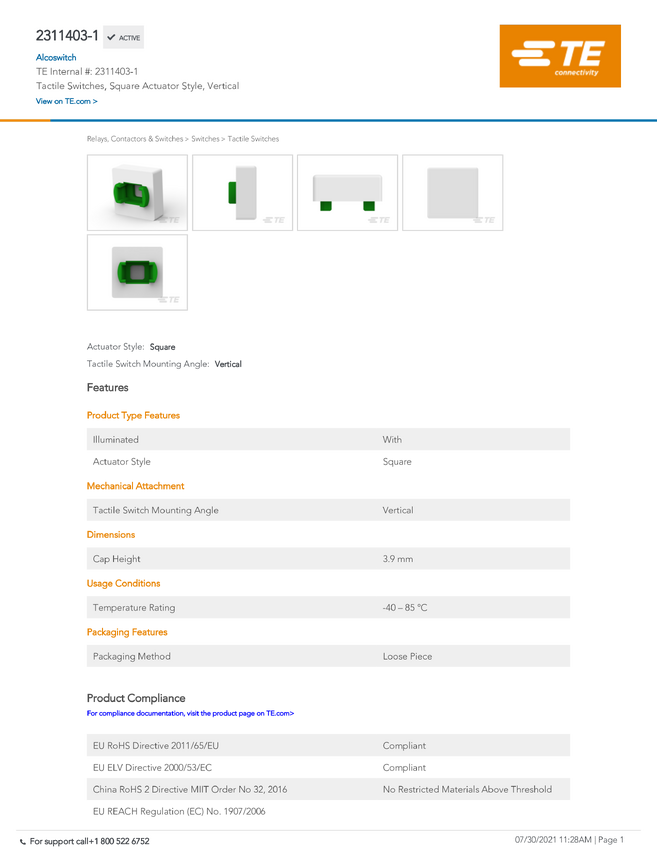 TE Connectivity 2311403-1 TE AMP Illuminated Tactile Switches 1 szt. torba