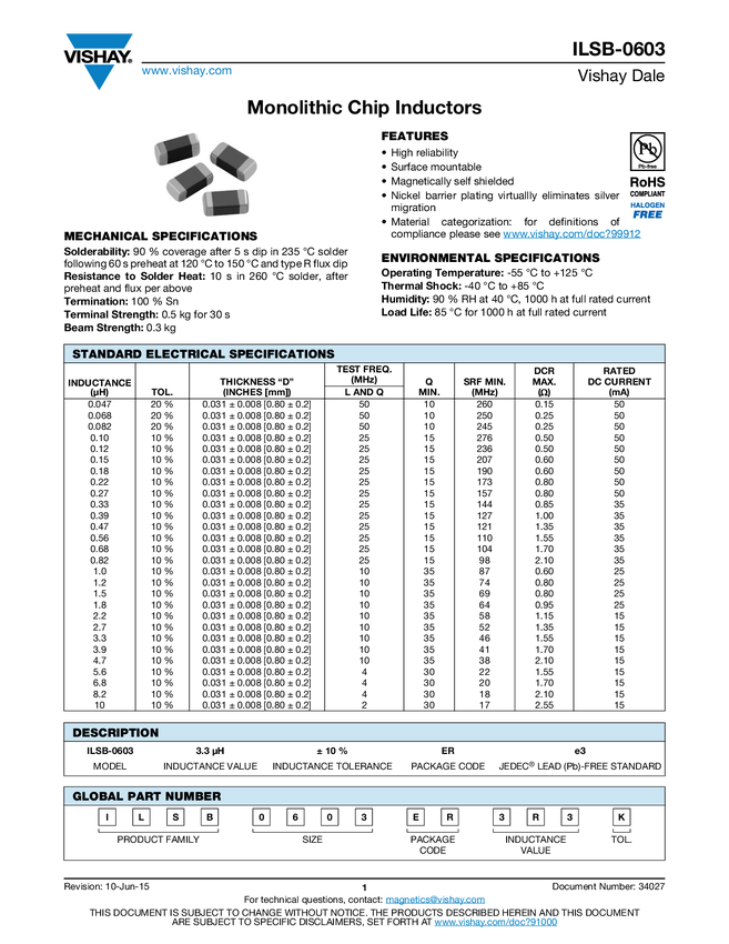 Ind Chip Shielded Multi-Layer 3.3uH 10% 10MHz 35Q-Factor 15mA 0603 T/R
