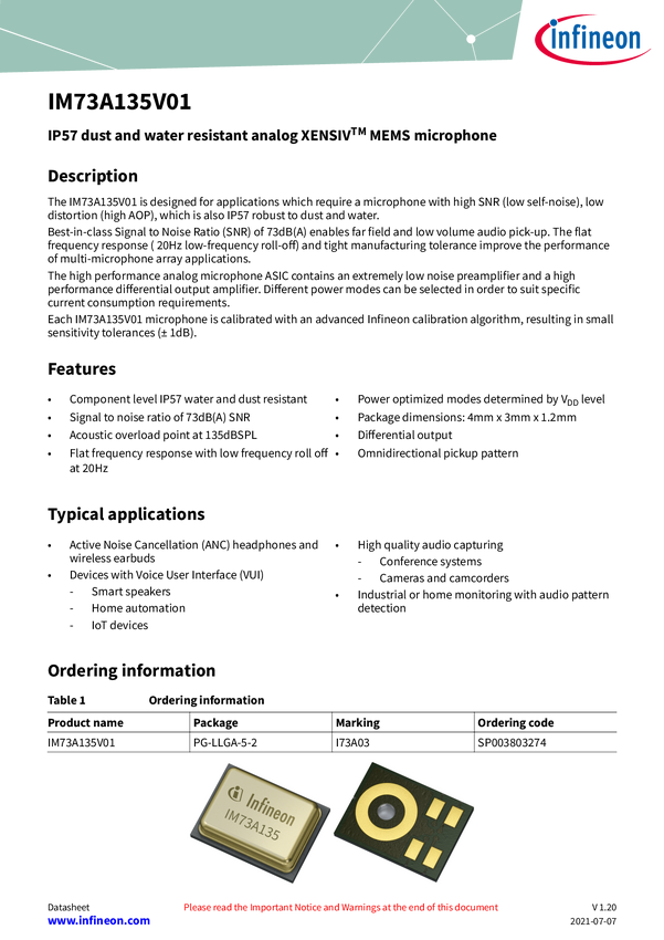 High performance XENSIV™ MEMS microphone with ultra high dynamic range Infineon's XENSIV™ analog MEMS microphone, IM73A135, sets a new performance benchmark with a best-in-class SNR of 73 dB and high acoustic overload point of 135 dBSPL. Sealed Dual Membrane (SDM) MEMS technology provides high IP57 ingress protection at a microphone level. The IM73A135 achieves superior audio performance, previously only achievable by ECMs while harnessing the advantages of MEMS technology.