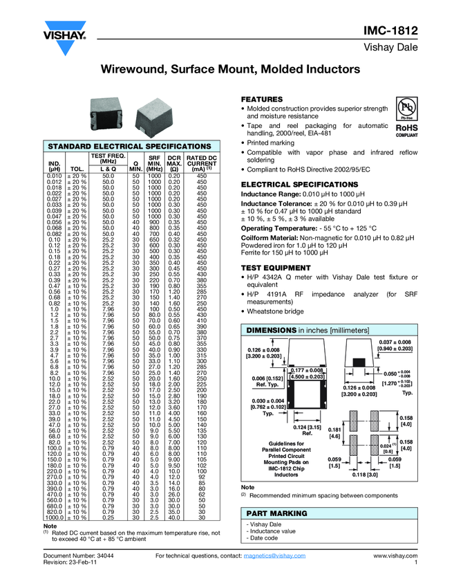 Ind Chip Molded Wirewound 6.8uH 10% 7.96MHz 50Q-Factor Powdered Iron 285mA 1812 T/R